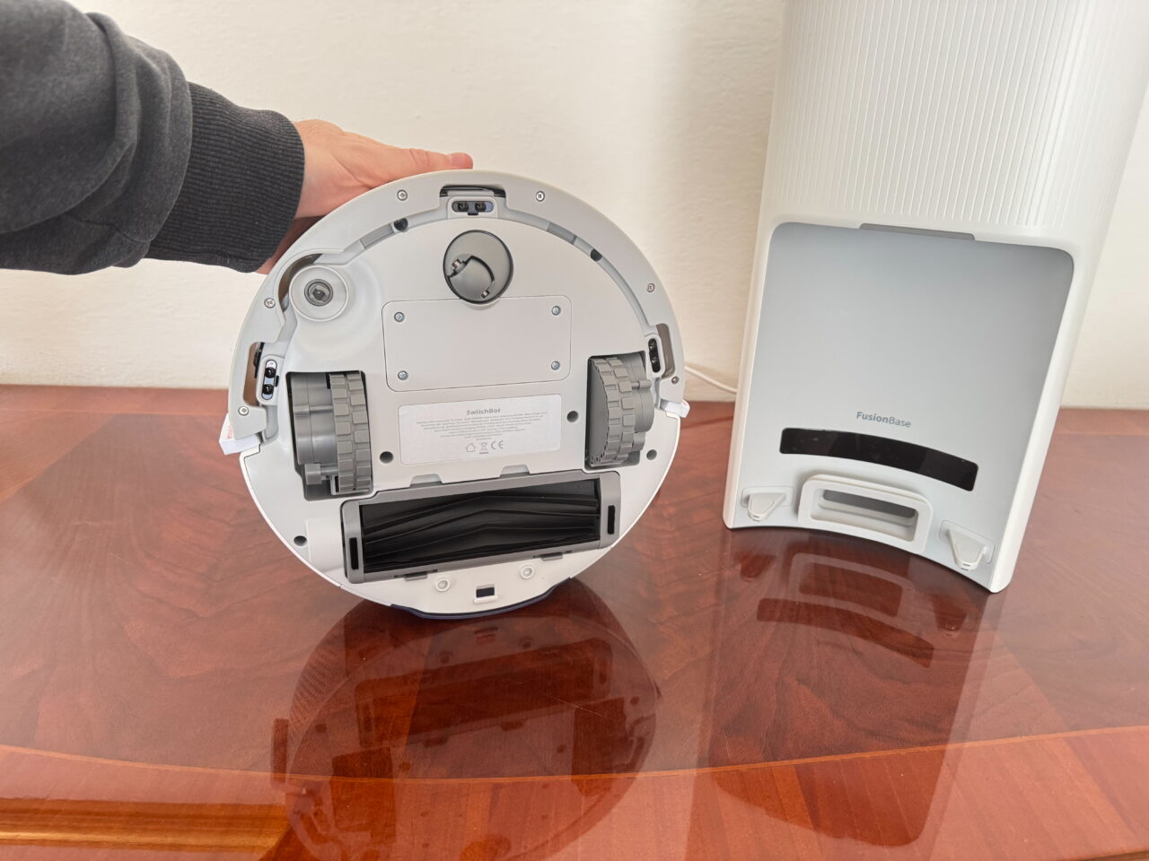 Nella parte centrale, sempre in alto, troviamo la torretta al cui interno è presente il Lidar per mappare la casa, mentre nella parte in basso troviamo due spazzole, quella classica che porta tutto dentro al serbatoio e quella laterale per andare a prendere lo sporco anche negli angoli più angusti, e tre sensori anticaduta.
