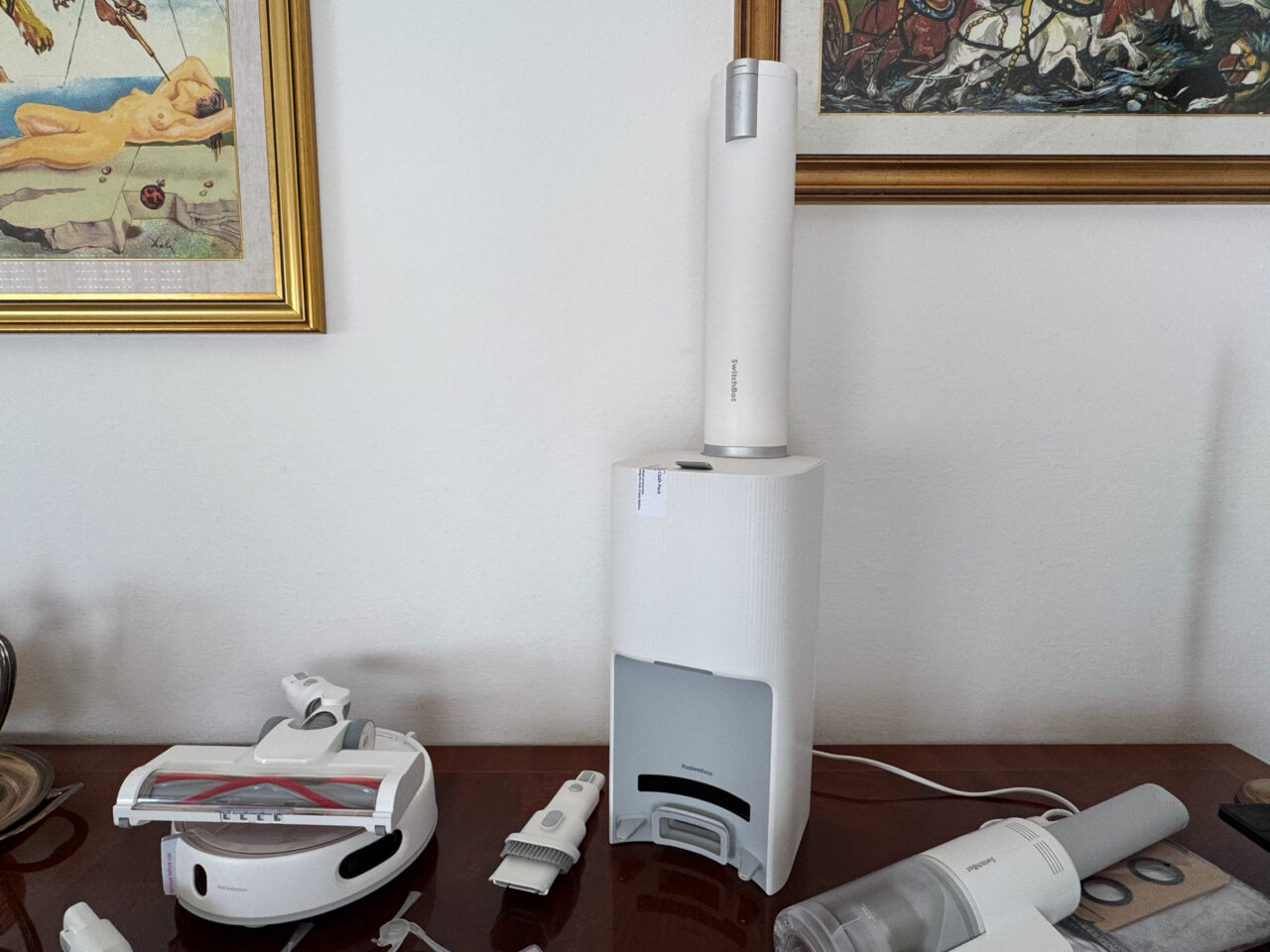 Il robot aspirapolvere è piccolissimo e può andare negli spazzi più stretti senza problemi, questo comporta ovviamente dei limiti come la capienza del serbatoio oppure il lavaggio pavimenti riadattato ad un semplice pezzo di plastica a cui annettere delle “salviette”, però a parte questo ho superato in pieno le mie aspettative oltre al fatto che è comandabile con i comandi vocali e con il supporto a Matter possiamo associarlo a vari ecosistemi domotici come Casa di Apple e tra poco lo vedremo pure come entità al suo interno.