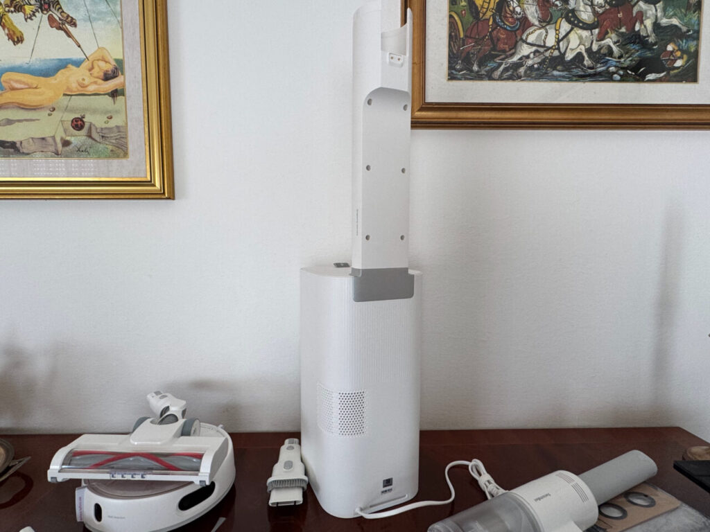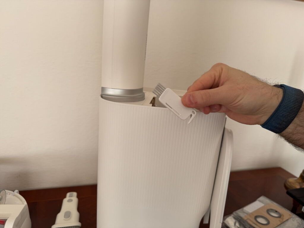 Questa base rappresenta il vero punto di forza, ma non è esclusivamente dedicata al robot. Grazie a un supporto aggiuntivo che verrà integrato nella parte superiore, sarà possibile collegare anche l’aspiratore senza fili. La caratteristica straordinaria è che la base non si limita a fungere solo da stand per l’aspiratore senza fili, ma convoglia anche la sporcizia all’interno della struttura principale, permettendo così di raccogliere lo sporco catturato da entrambi gli aspiratori in un unico punto. Davvero incredibile!!!!!!!