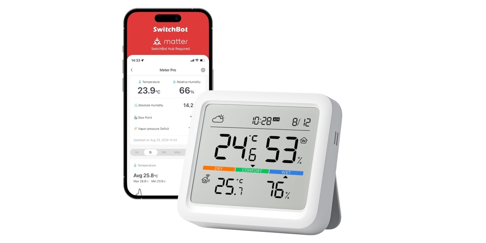 Meter Pro rappresenta una grande stazione meteo per la nostra casa, che con l’aiuto di un grande schermo LCD monocromatico da 3,6 pollici da modo di avere alcune informazioni utili; non solo della parte interna della nostra casa ma anche esterne grazie ad un altro sensore SwitchBot come Meter Plus o Outdoor Meter. Sarà visibile la data, ora, anche un indicatore di “comfort” relativo all’umidità (con opzioni di “asciutto”, “comfort” o “bagnato”) e previsioni meteo della zona con l’associazione all’Hub 2; Hub che con il supporto a Matter potremo aggiungere a Google Home, Amazon Assistant e ad Apple Home App.