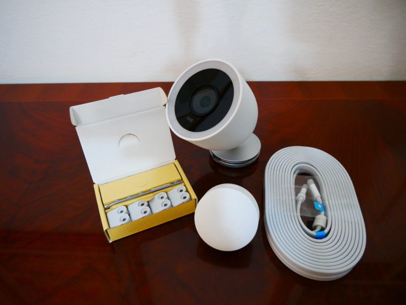 Iniziamo dalla più piccola delle sorelle, ed anche la più semplice, la Nest Cat Indoor si avvicina maggiormente alle altre videocamere di sorveglianza presenti sul mercato; ma se può esserlo per il design, per tutto il resto non è cosi, infatti la sua costruzione è in metallo, cosi come il supporto da parete (con fermacavo) presente in confezione, in cui troviamo anche tre viti per il montaggio ed un lungo cavo microUSB/USB-A con alimentatore circolare.