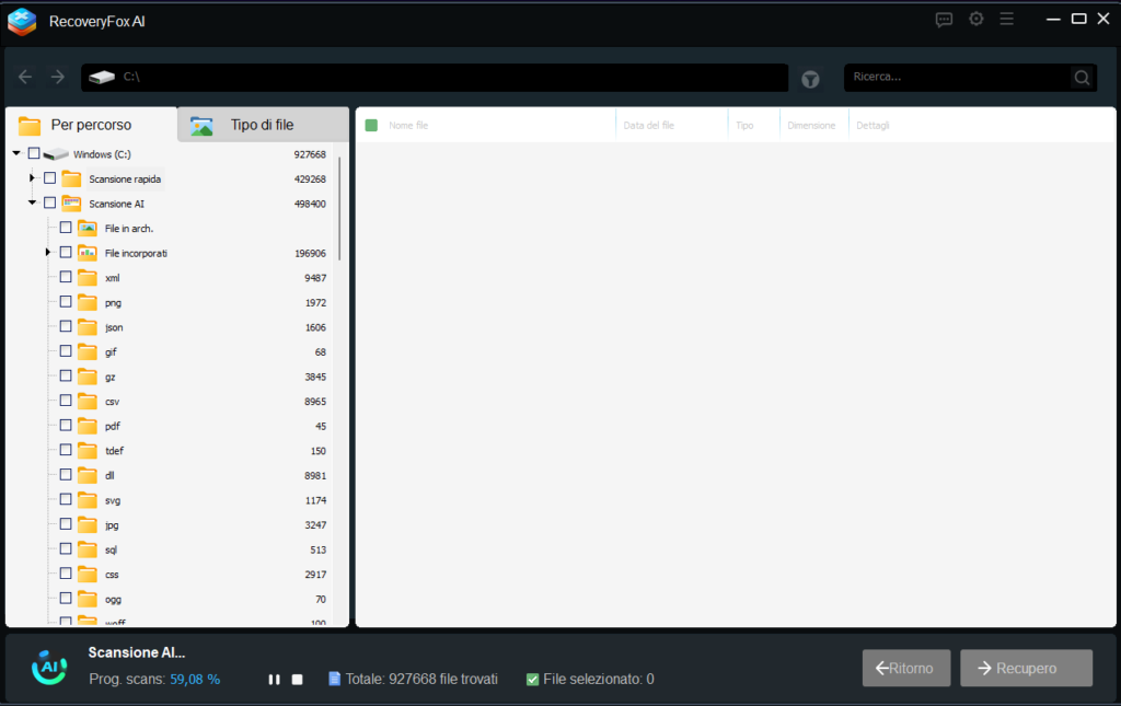 Una volta selezionato il disco, facciamo partire la scansione. ATTENZIONE, questa cosa potrebbe durare un bel po’ di tempo, la tempistica dipende dalla grandezza del disco, dovremmo essere molto pazienti. Lo scan avviene in due modalità, la prima “normale” e la seconda tramite AI. mentre il sistema fa lo scan, possiamo già scegliere,dal percorso (esempio il disco C) le cartelle o le tipolgie di file (esempio pdf o jpg, ecc ecc).