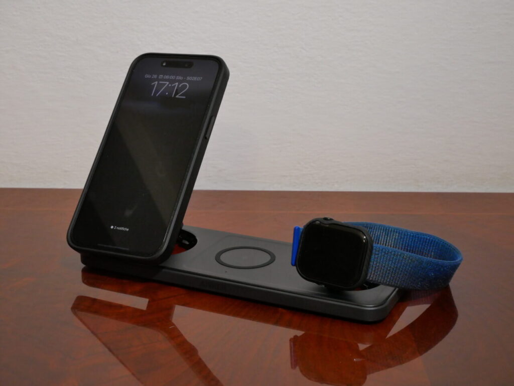 Tolta dalla confezione ci troviamo difronte ad una tavoletta rettangolare (23 x 8,5 x 1,4 cm ed un peso di 340 grammi) con tre sezioni di ricarica; si può ricaricare in modalità wireless magnetica un iPhone (compatibile alla ricarica MagSafe) alla potenza di 15W, la stessa di Apple MagSafe, le AirPods a 5 W (oppure, nella stessa sezione, anche un iPhone ma vista la potenza la ricarica sarà molto lenta) ed infine un Apple Watch a 5W con ricarica veloce (serie 7, 8, 9, 10, SE e Ultra, Ultra 2).