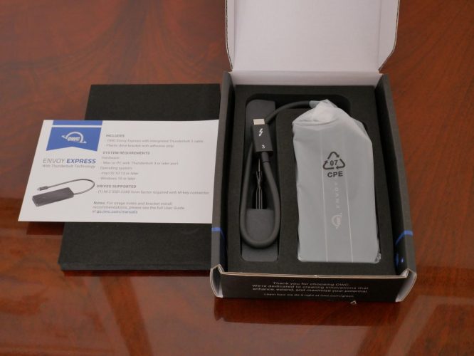 Cosa non molto rilevante ma un piccolo aspetto da tenere in considerazione, nella parte interna del coperchio di Envoy Express vi è uno speciale “adesivo” che si appoggia saldamente al modulo NVMe installato. È chiaramente pensato per condurre il calore dal modulo al coperchio in alluminio, mantenendo l’SSD all’interno il più fresco possibile. La sua massima velocità di lettura / scrittura supportata arriva a 1550 MB / sec, probabilmente per evitare il surriscaldamento all’interno della custodia.