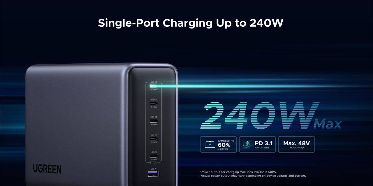 Supporta la ricarica ultraveloce simultanea per un massimo di sei dispositivi, con una potenza massima di 240 W per singola porta, sufficientemente potente da caricare laptop ad alte prestazioni alla massima velocità.